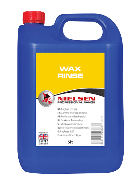 Nielsen Wax Rinse on vahakomponentidega lõputsükli loputusvahend, mis tõrjub vett, kiirendab kuivamist ja kaitseb laki pinda uue mustuse eest. Sobib nii autopesulasse kui survepesurisse. Saadaval 5L ja 20L.